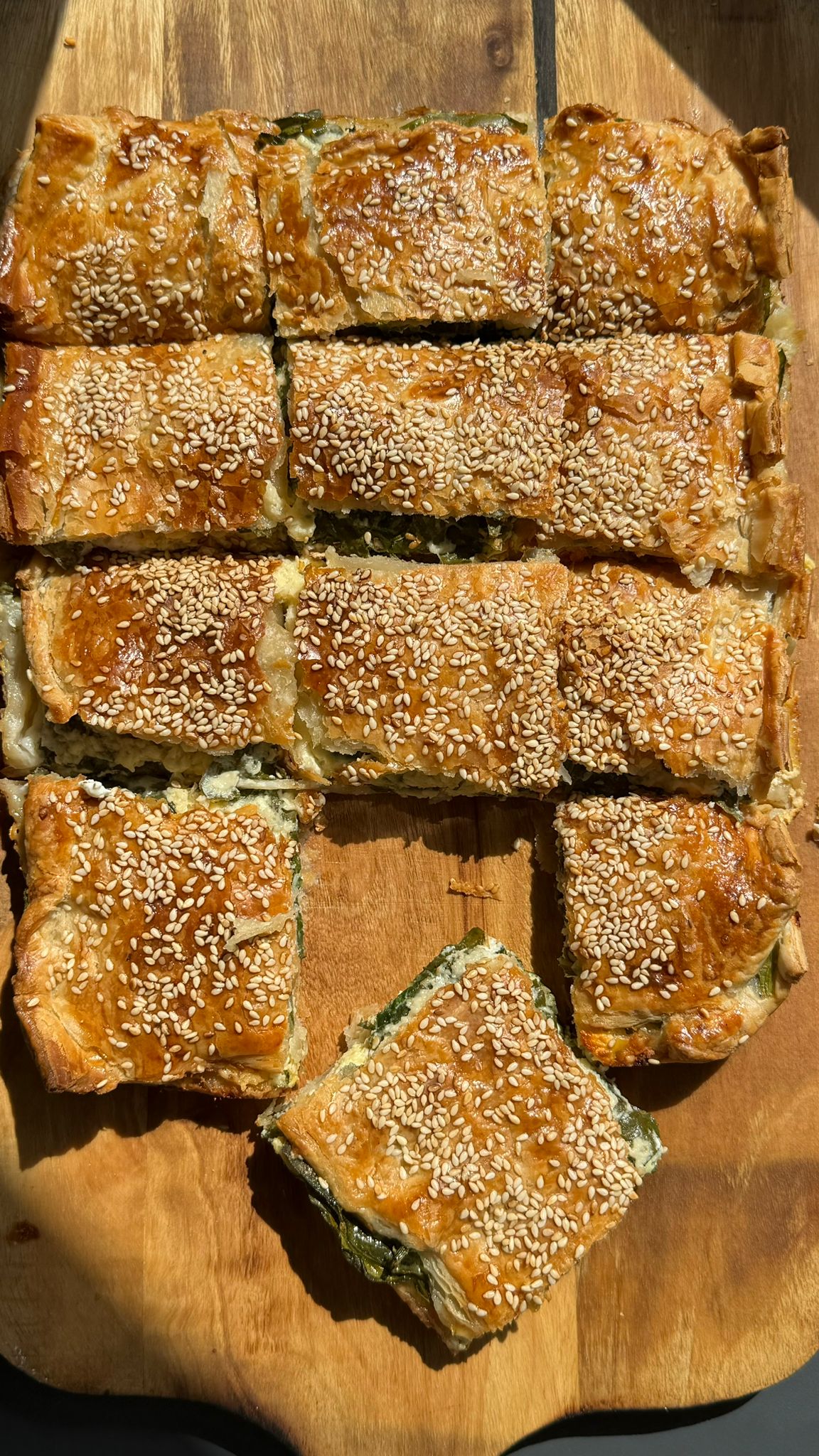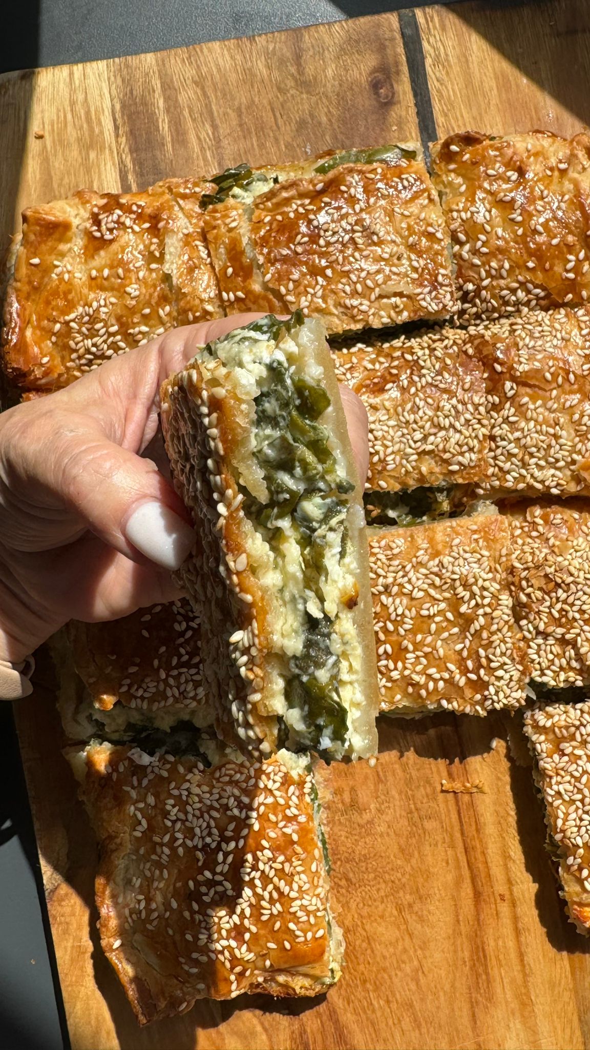 אני הכנתי מבמק פילו . כל עלה מרחתי שמן זית . שמתי שלוש שכבות כלומר כל שכבה הם : 2 עלי פילו שכל אחד מהם מרחתי בשמן זית . .כל שכבה פיזרתי את התערובת ומעל שכבת התערובת שמתי שוב 2 עלי פילו מרוחים. כך שליש פעמים שמתי 3 שכבות התערובת. לגבי התערובת הכנתי מגבינות גבינות עזים של גד , הכמות גבינות הם 250 גרם גבינת עזים . הוספתי 2 ביצים ושמתי גבינות צהובות של גבי ות עזים מגוררת .כמות התרד 800 כרם. . לבסוף מרחתי הביצה את העלי פילו ופיזרתי שומשום. למה עברתי להכין מעלי פילו כי הם שומרי משקל. ומה שבסוף קיבלתי מחמאות שטים מאוד מיוחד פחות בצק.