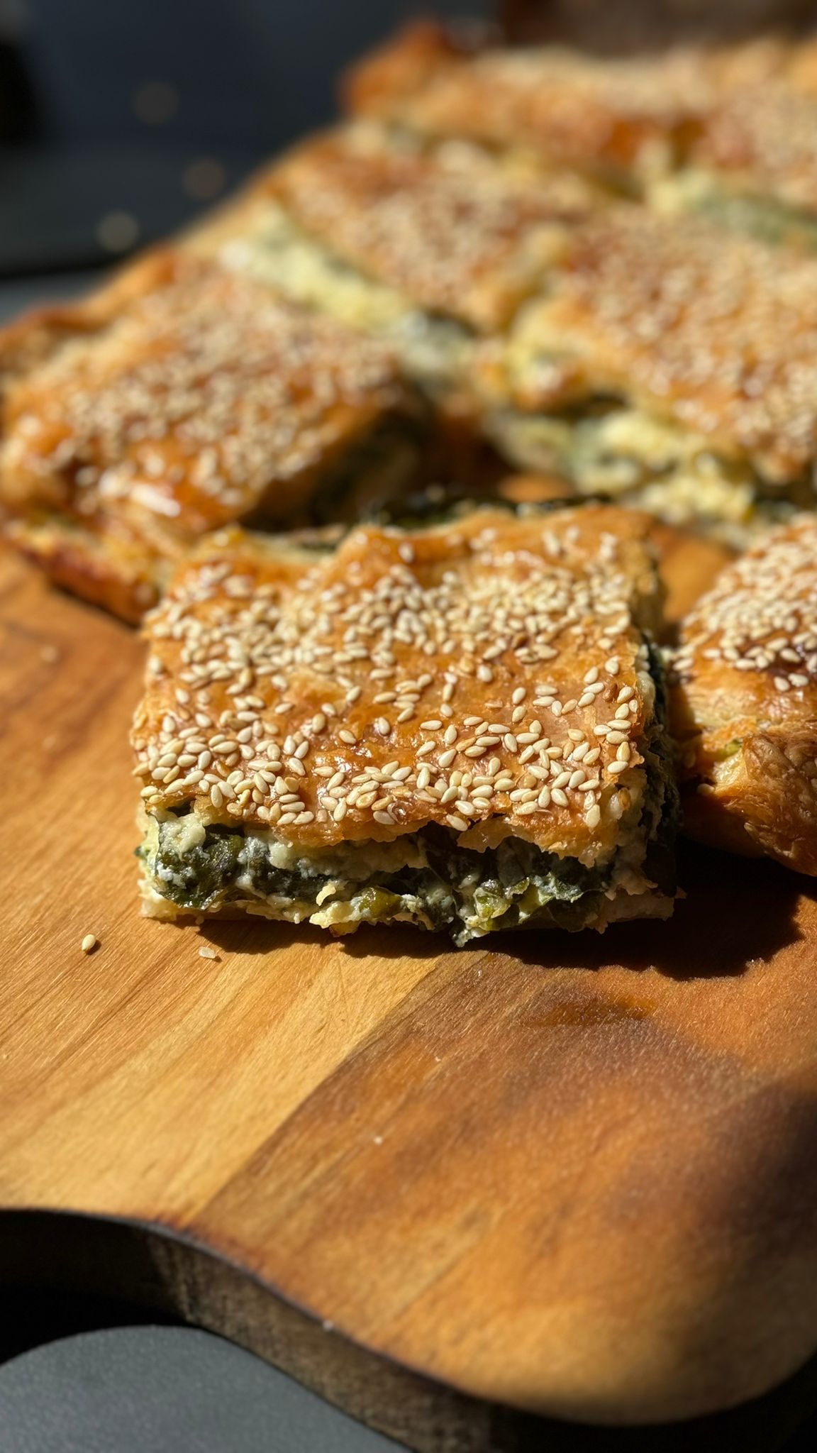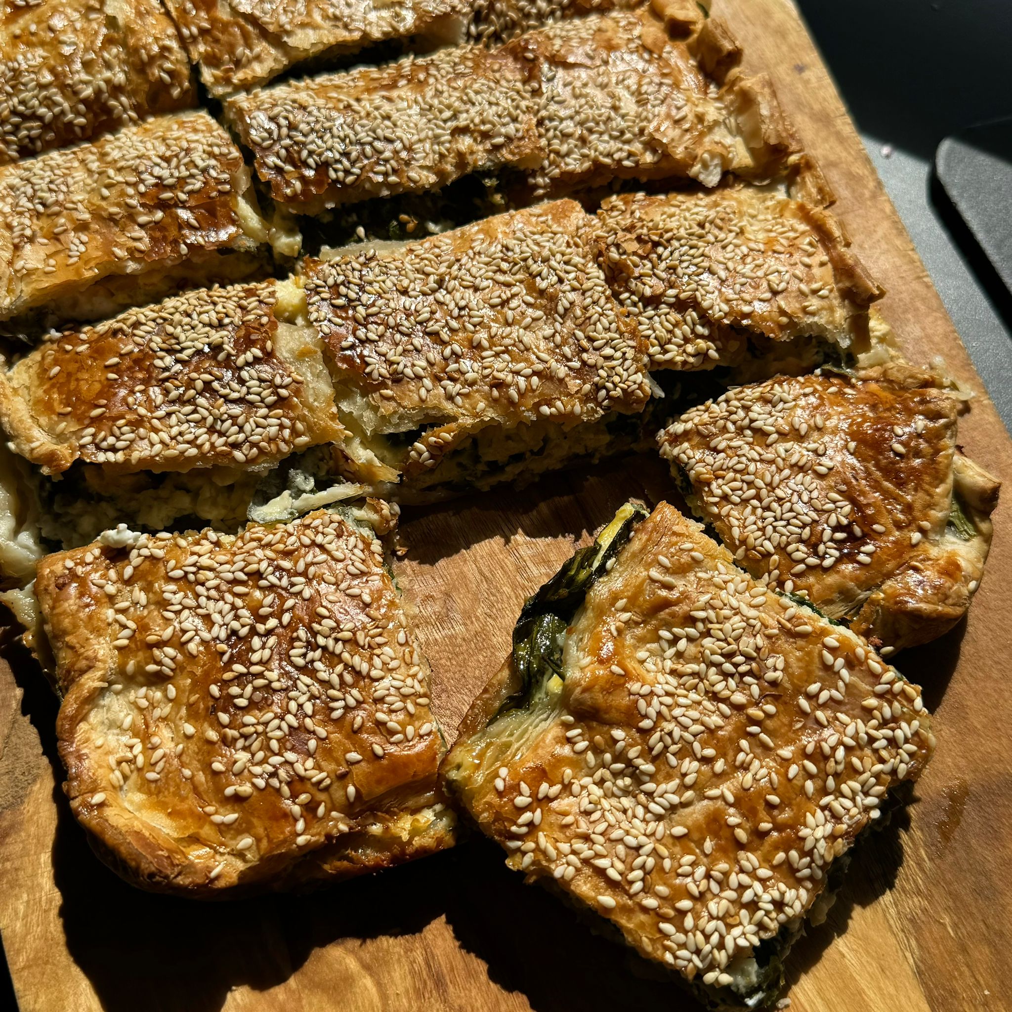 אני הכנתי מבמק פילו . כל עלה מרחתי שמן זית . שמתי שלוש שכבות כלומר כל שכבה הם : 2 עלי פילו שכל אחד מהם מרחתי בשמן זית . .כל שכבה פיזרתי את התערובת ומעל שכבת התערובת שמתי שוב 2 עלי פילו מרוחים. כך שליש פעמים שמתי 3 שכבות התערובת. לגבי התערובת הכנתי מגבינות גבינות עזים של גד , הכמות גבינות הם 250 גרם גבינת עזים . הוספתי 2 ביצים ושמתי גבינות צהובות של גבי ות עזים מגוררת .כמות התרד 800 כרם. . לבסוף מרחתי הביצה את העלי פילו ופיזרתי שומשום. למה עברתי להכין מעלי פילו כי הם שומרי משקל. ומה שבסוף קיבלתי מחמאות שטים מאוד מיוחד פחות בצק.