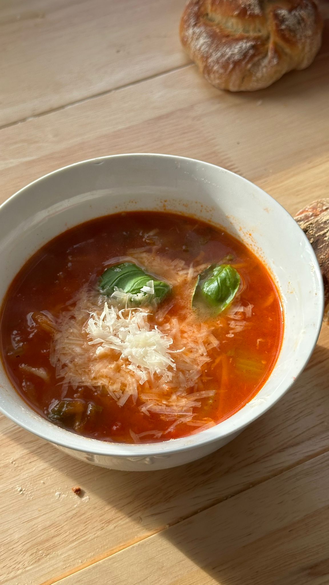 מרק עגבניות עם פסטה, שהיא הגישה עם פרמז׳ן וקוביות אבוקדו טרי וזה יצא מטורף. הטעמים של המרק היו כל כך טובים והמרקם שלו