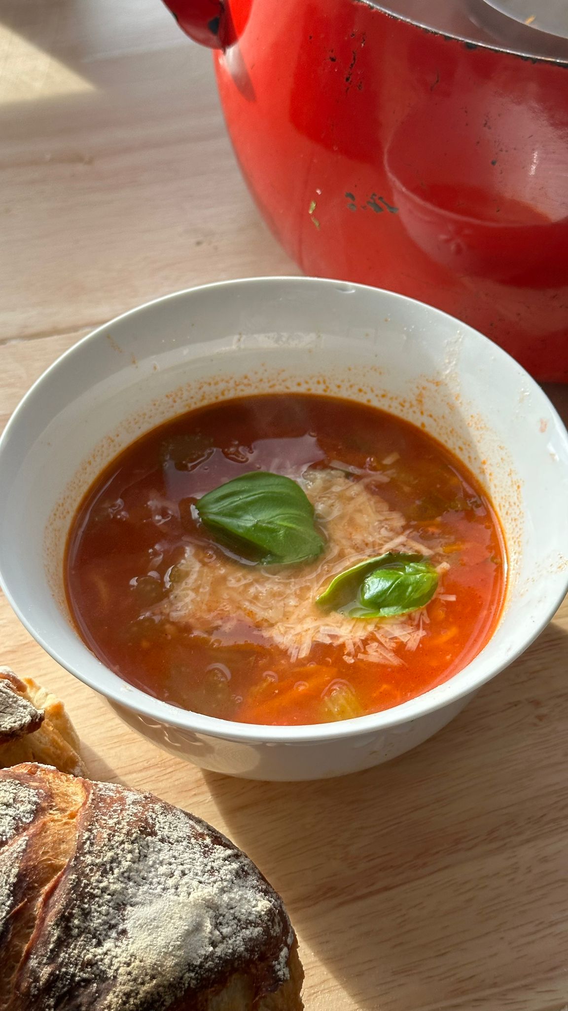 מגישים חם, מוזגים לצלחות מרק חם, מפזרים עלי בזיליקום וגבינת פרמזן ומגישים עם לחם טרי